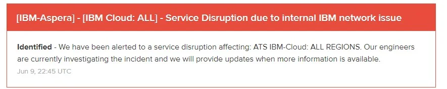 It looks like the problems started around 2:30pm PT and spread from there. Best we can tell, this is a worldwide problem and involves a networking issue, but IBM’s own status page isn’t actually loading anymore and returns an internal server error, so we don’t quite know the extent of the outage or what triggered it. IBM Cloud’s Twitter account has also remained silent, though we found a status page for IBM Aspera hosted on a third-party server, which seems to confirm that this is likely a worldwide networking issue.