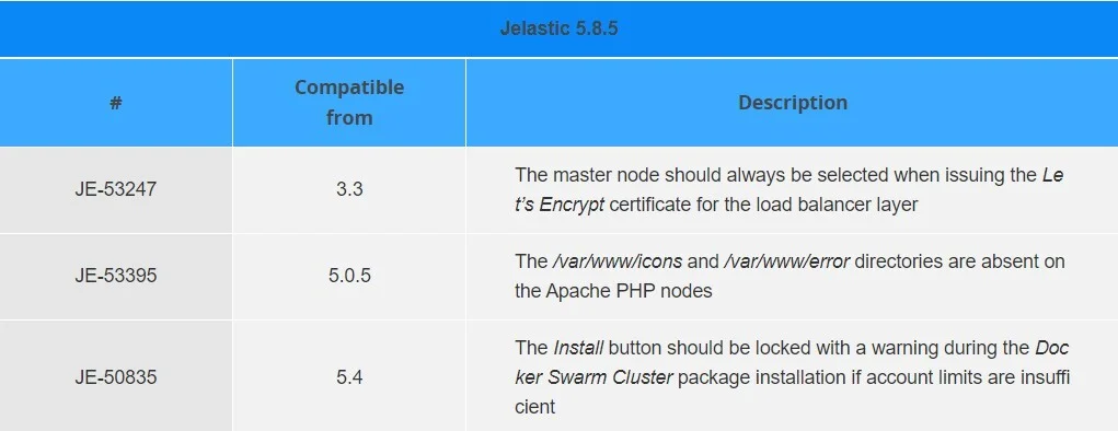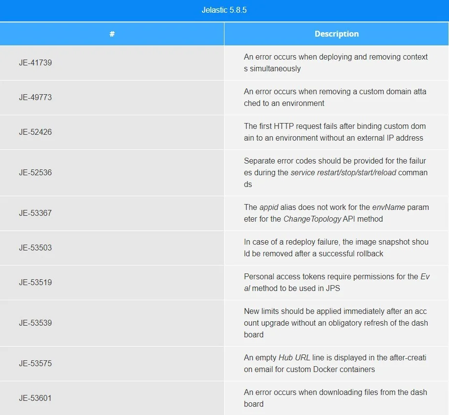 Below, you can find the fixes that were implemented in the Jelastic 5.8.5 release and also integrated into previous Jelastic versions by means of the appropriate patches.